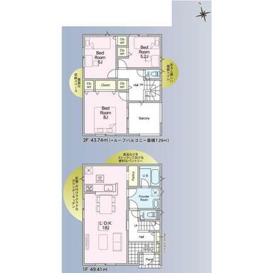 号棟番号:2号棟 前面道路幅員制限 法第22条区域 土地面積に路地状部分約49平米を含む 建物面積に別途ルーフバルコニー約7.29平米有り |